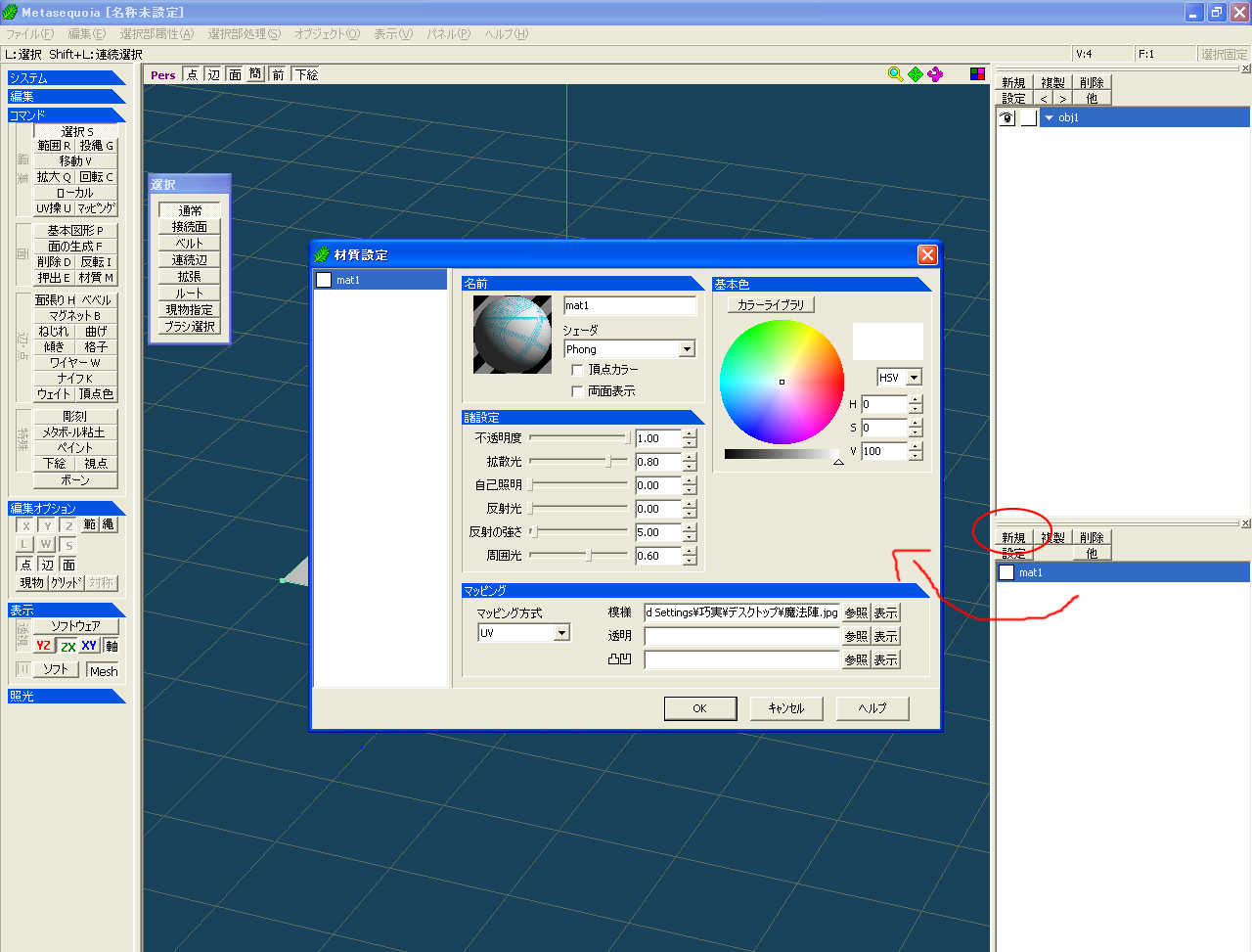 右下の枠に『新規』があるのでそこをクリックすると『mat1』が作成されます。