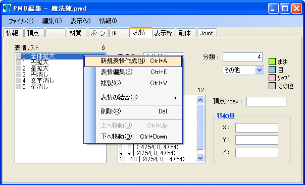 種類は頂点でOK。パネルはMMDの表情タブそのままの意味です。